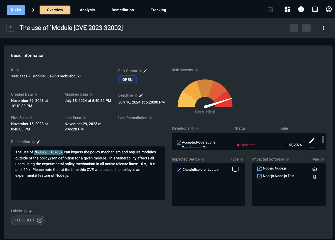 - Status – The current state of the risk, including: Open, Investigating, Remediating, Deviation Requested, Deviation Approved, Closed.