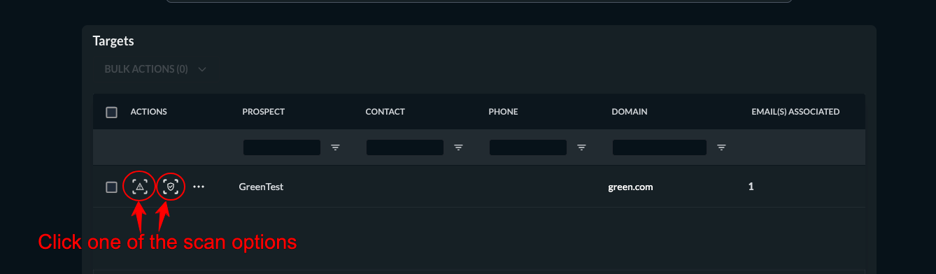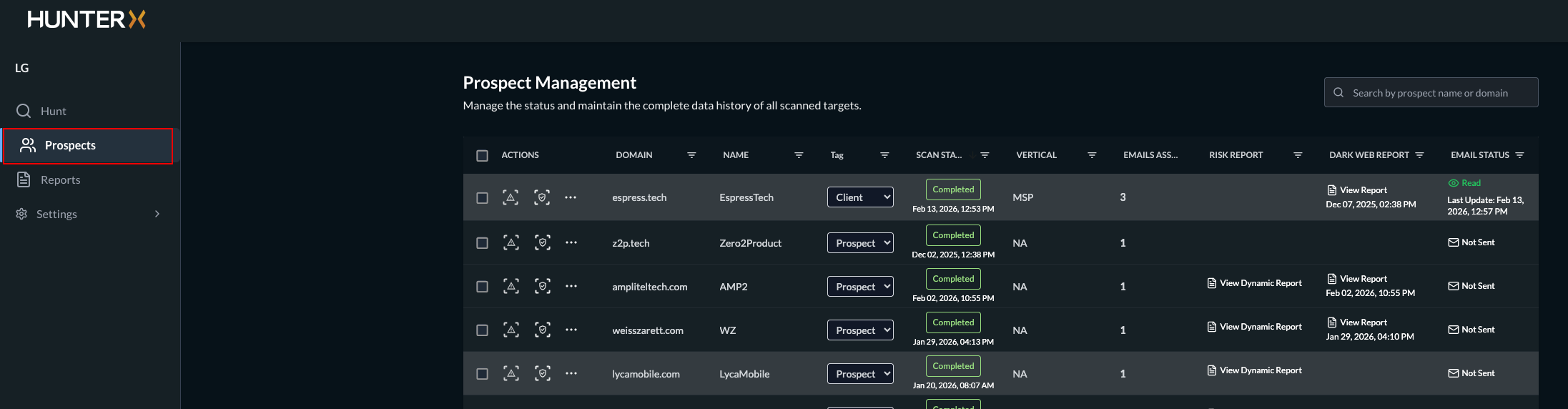 After selecting a scan option, all targets will be displayed on the Prospect Management page.