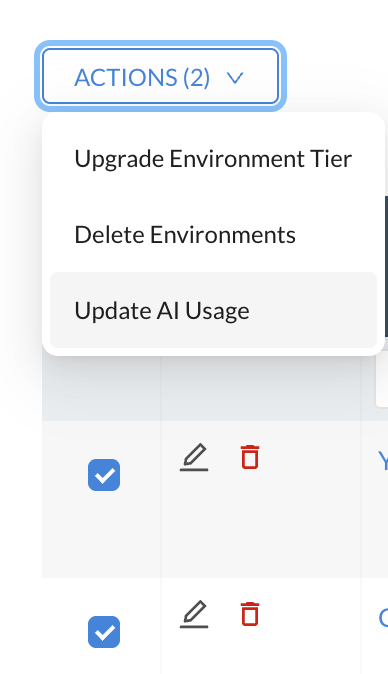 Locate the environment(s) and toggle on the feature under the "AI USAGE" column.