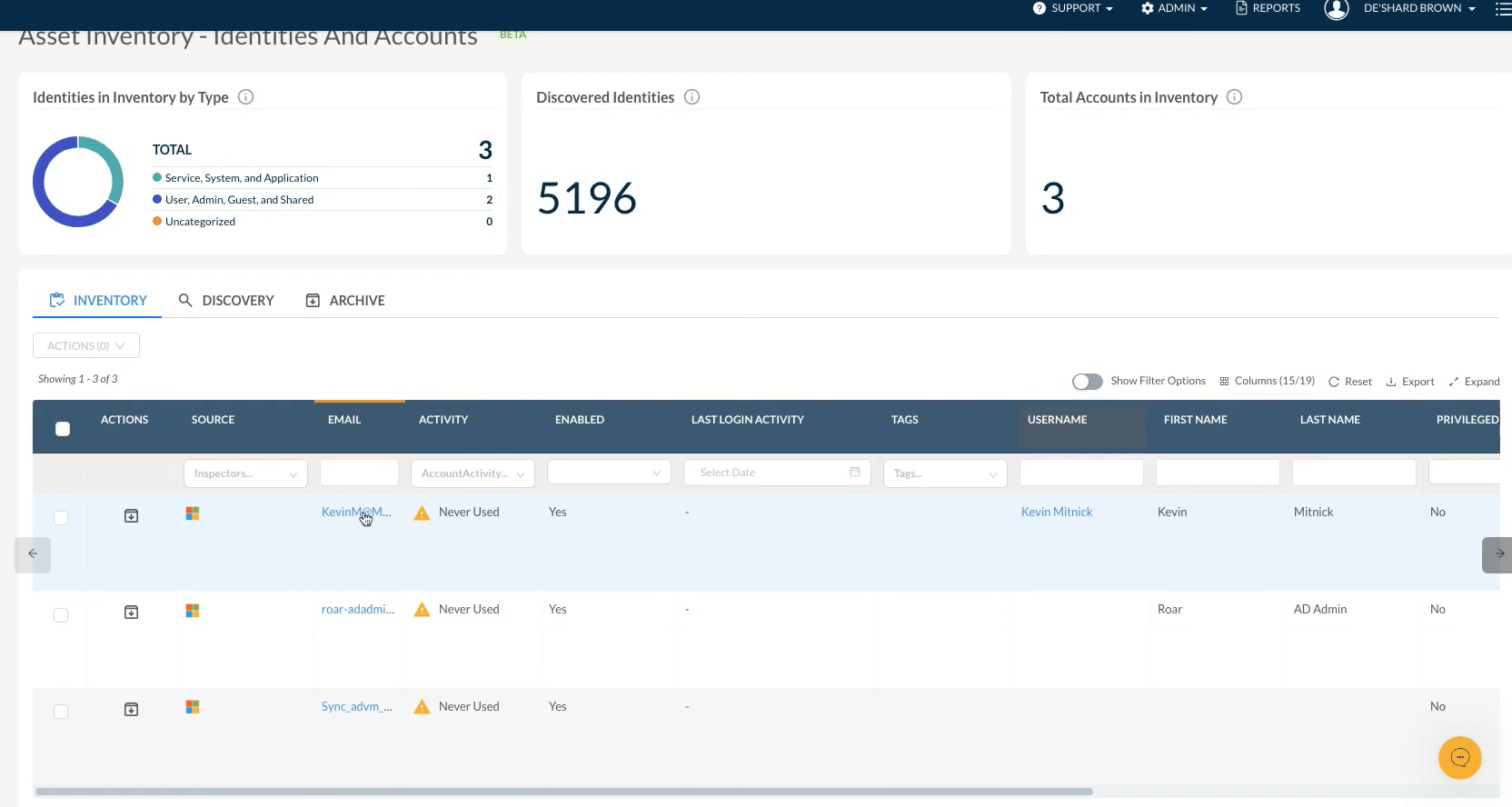The dashboard groups accounts by matching email addresses to Identity Records. As Liongard finds new email addresses, it creates or merges new identities with existing ones. Easily classify identities by selecting identities in the Discovery tab and move them to Inventory or Archive as needed using the Actions drop down.