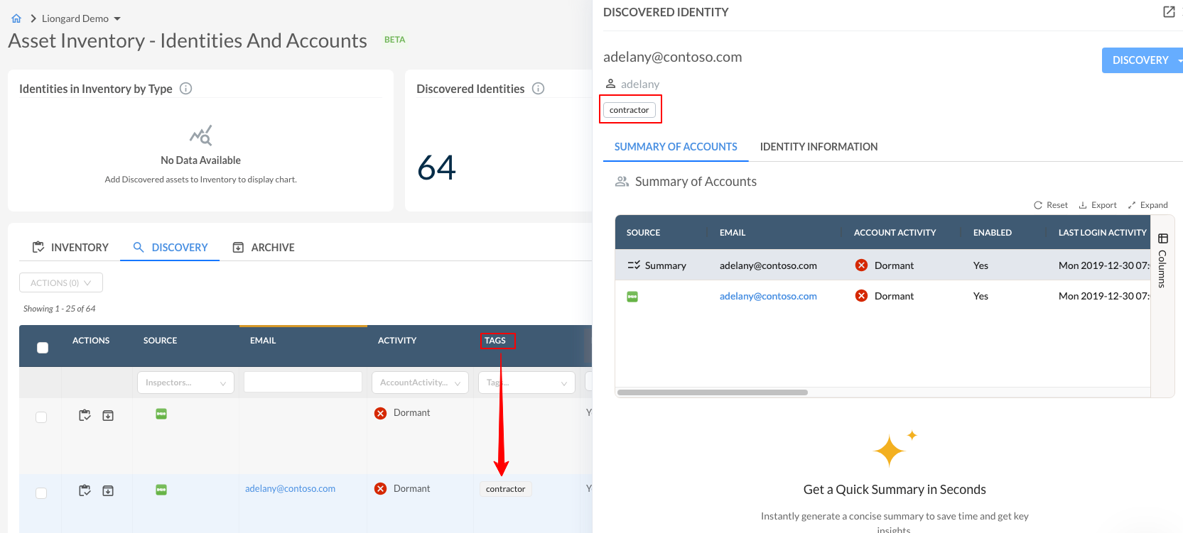 Identity Tagging gives you the ability to tag assets using custom labels, enhancing the identification and classification of identities according to your specific policies and criteria. Tags are visible at the top of the asset name in the details panel and are also visible within the inventory tables.