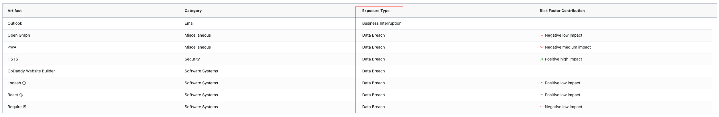Each detected technology is assessed for its correlation with historical breach data.