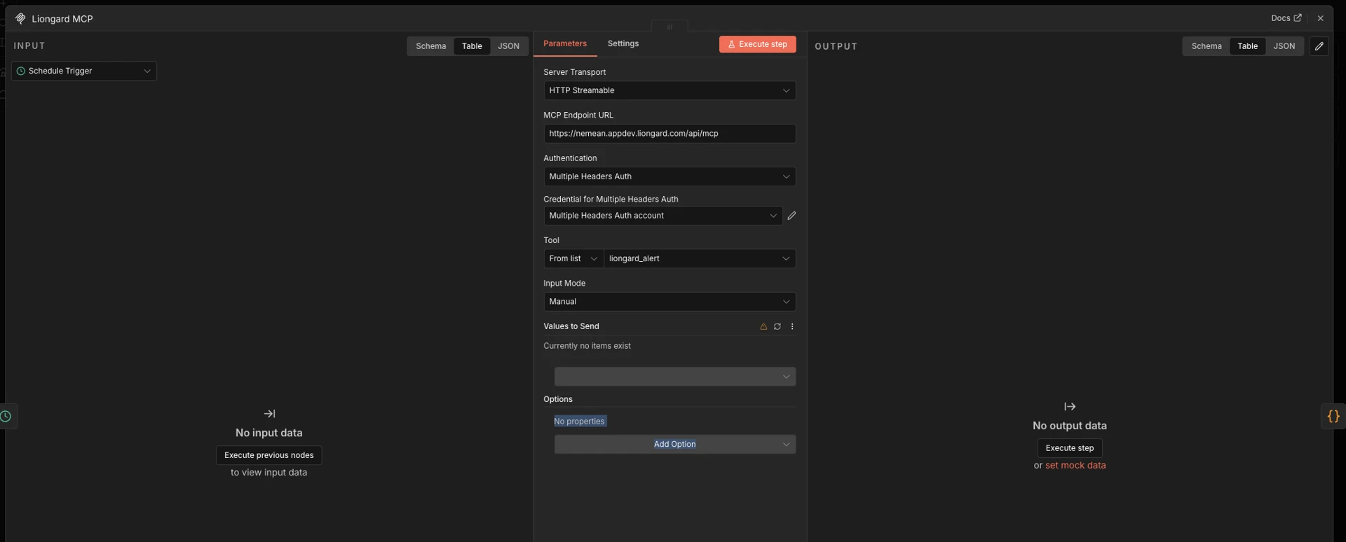 Create an MCP client node, using this credential as the auth and https://(instance).app.liongard.com/api/mcp as the MCP endpoint url.