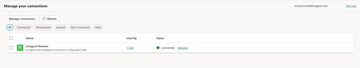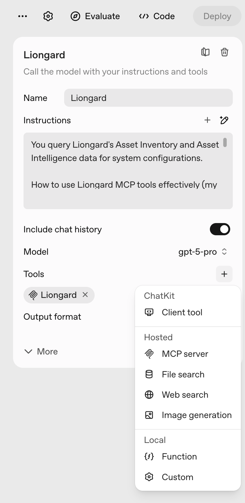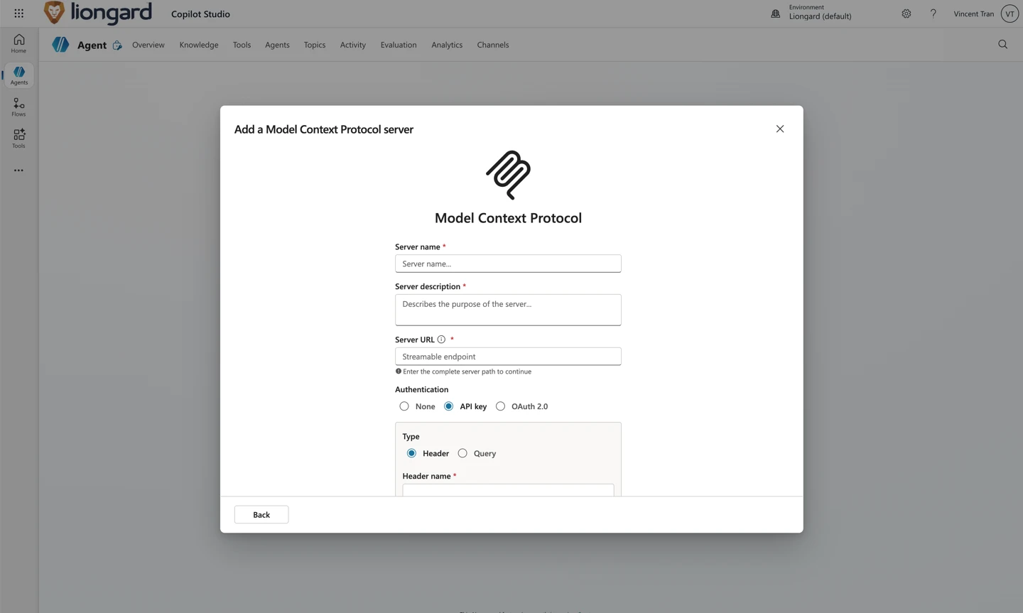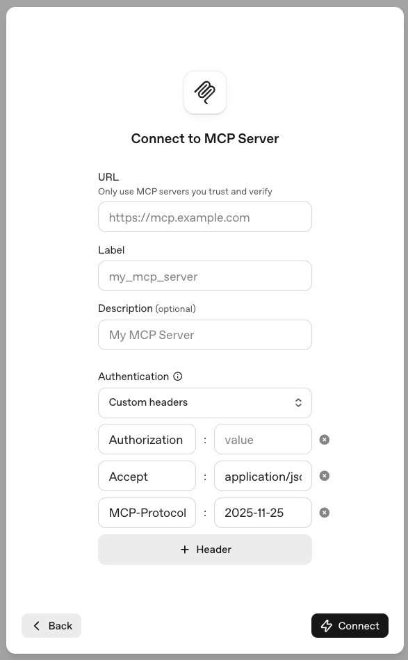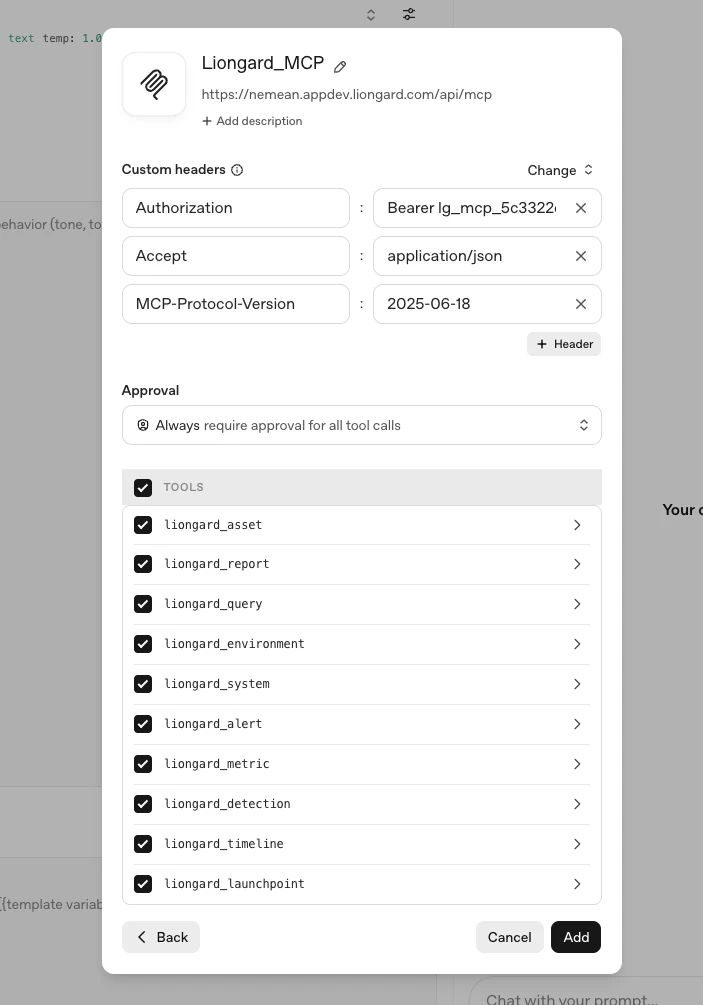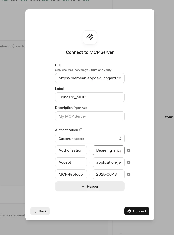 URL: https://[SERVER].app.liongard.com Label: Liongard Description (optional): Label as needed Authentication: Select Custom Headers Authorization: Bearer [ACCESS_KEY_ID]:[ACCESS_KEY_SECRET] Accept: application/json MCP-Protocol: 2025-11-25