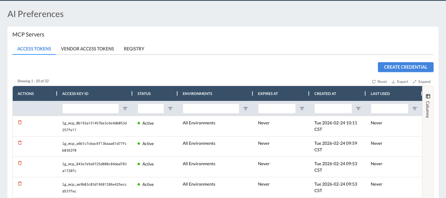 - MCP Access Tokens: Provides secure, tenant-wide API access to MCP data.