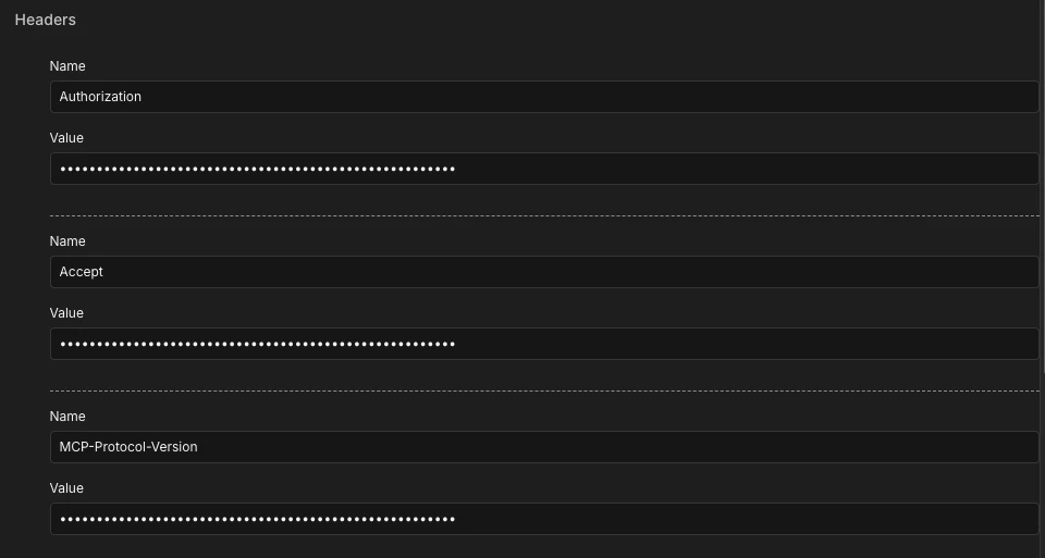 Authorization: the MCP token from the dashboard (Authorization key is the complete string, including Bearer prefix and token with secret separated by a
