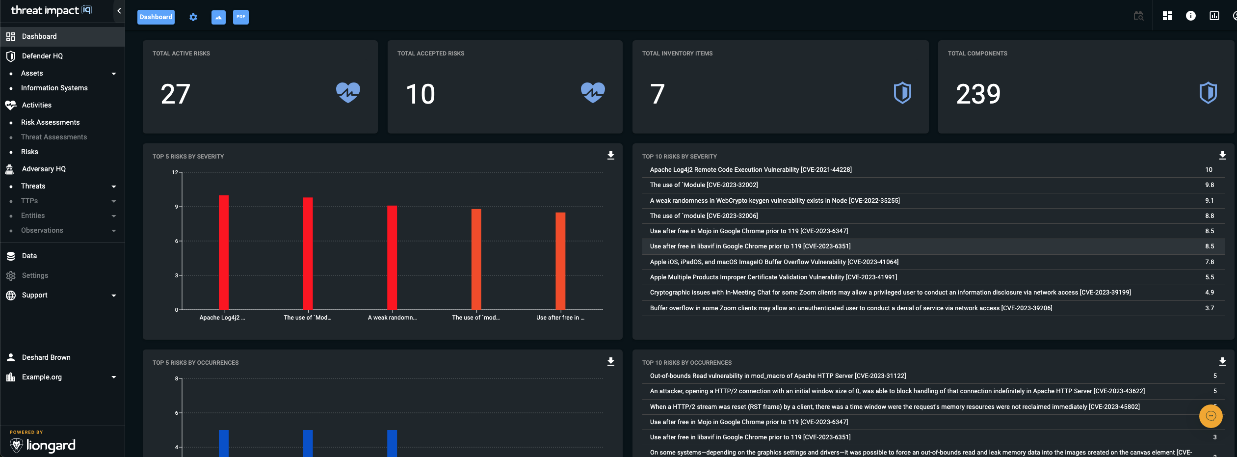 When you log into ThreatImpact IQ, you are presented with a default dashboard that provides an immediate overview of your organization’s key security indicators. This dashboard includes a set of widgets and charts that display essential information at a glance.