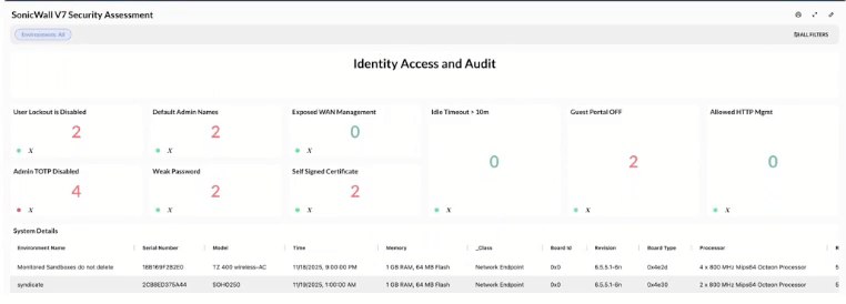 This dashboard provides a consolidated view of SonicWall’s security posture across traffic hygiene, encryption, identity and access, and perimeter defenses, highlighting misconfigurations and areas of risk.