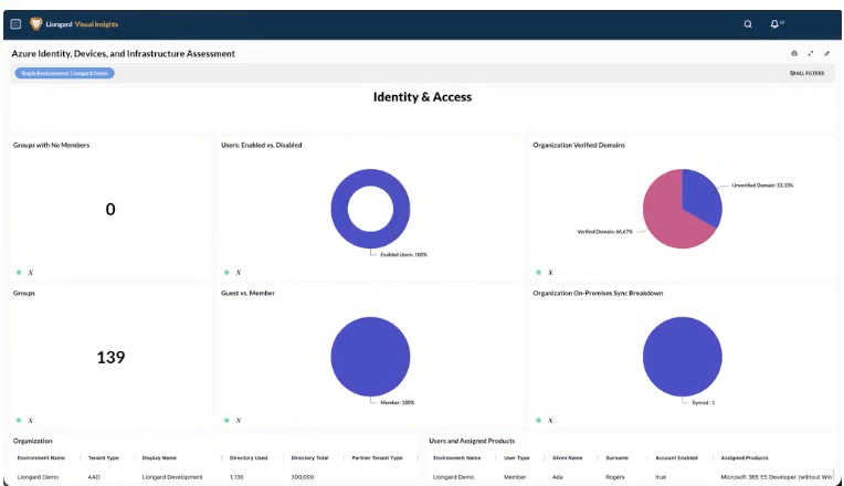 This dashboard offers a unified view of your Azure environment, summarizing identity, device, security, and licensing posture through clear visuals of user access, device compliance, infrastructure assets, and security configurations. By surfacing key metrics and potential risks, it enables rapid assessment of overall environment health and configuration readiness.