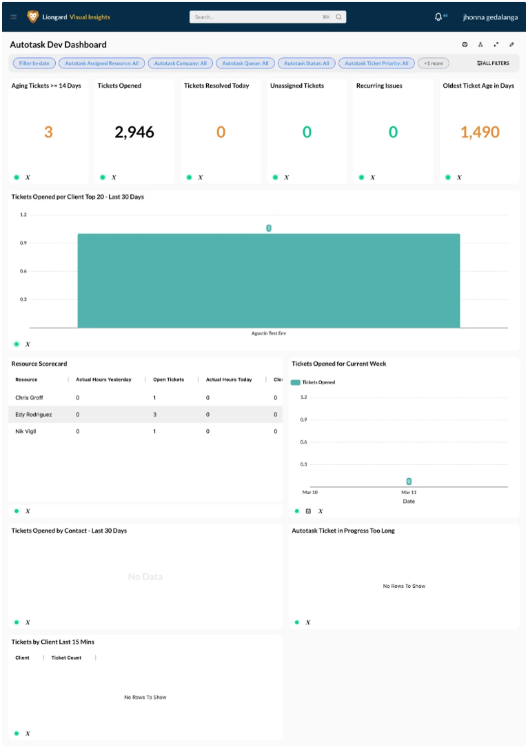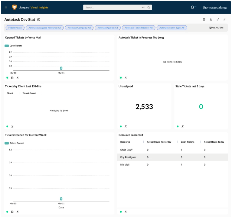 The Autotask Dev Dashboard provides near real-time visibility into service desk activity, helping you monitor ticket volume, technician performance, and client demand.