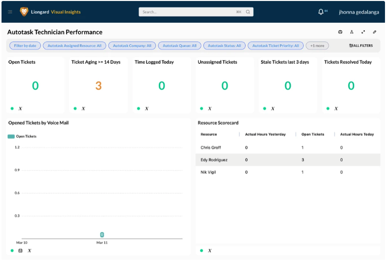 The Autotask Technician Performance Dashboard provides a focused view of technician productivity and ticket activity through key KPIs, voicemail-driven ticket trends, and a detailed resource scorecard—helping you track workload, performance, and ticket management efficiency at both the team and individual level.