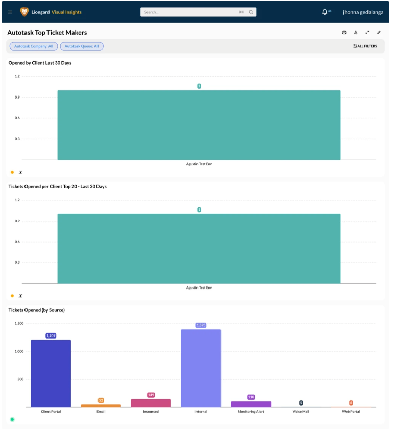 The Autotask Top Ticket Makers Dashboard provides a clear view of ticket demand by highlighting which clients generate the most tickets over the last 30 days. It also breaks down ticket volume by source, helping you understand where requests are coming from and identify trends in client activity.