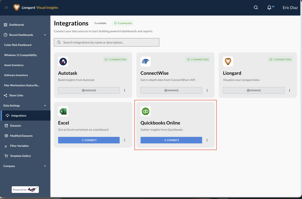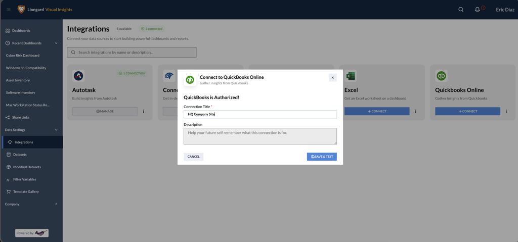 This guide explains how to configure the QuickBooks Online connector in Visual Insights, including authorization, connection validation, and dataset syncing.